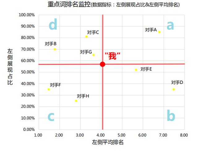 d区域竞争对手需要重点关注,左侧展现占比很高且有较好的排名;a和c区域在其中一项指标上有优势;b区域暂时可忽略。