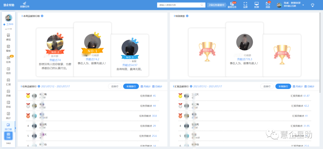 如在慧企星助体系中,对公司制度的执行度转化为贡献值来来量化考核,而贡献值与员工薪酬体系、考核机制、奖惩措施相通。遵守公司制度的,有贡献值奖励,违法的进行扣除,奖惩分明。